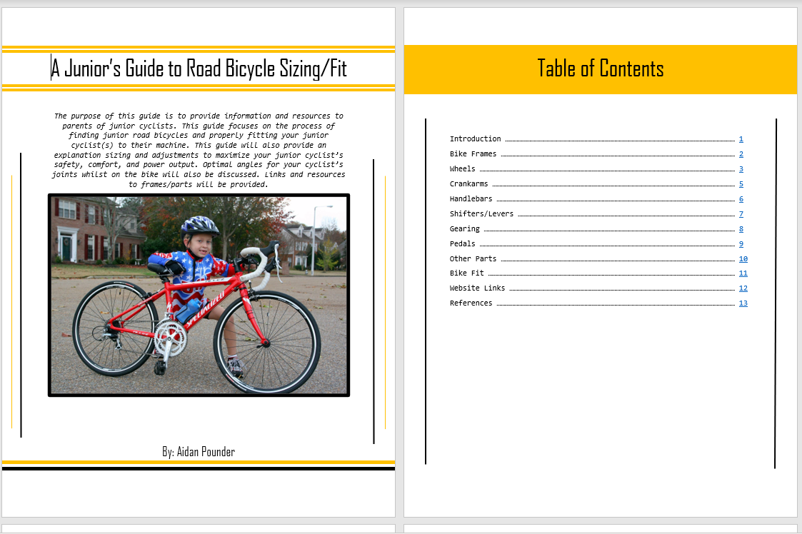 Technical writing covering junior cycling, bikefit, safety on bicycles, and cyclist positioning. Road bike frames from Specialized, Frog Bikes, and more are linked into the report.